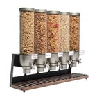 Provide your guests with five of your most popular cereals, candies, salad toppings, or snacks simultaneously with this Rosseto EZ558 EZ-SERV 4.9 liter five canister tabletop food dispenser with stainless steel stand and catch tray. This food dispenser makes serving food effortless and fun! It's made with five durable, clear acrylic canisters for optimal product visibility for easy identification. At the same time, the stainless steel stand and catch tray also add a flair that works great in cafes, hotels, breakrooms, and school cafeterias. Each canister has a capacity of 4.9 liters so that you'll never run out of your customer's favorite food, yet the dispenser is easy to move and lightweight in design for easy transport in buffets and stores. Acrylic label holders are included that snap onto the stand and can hold 2 1/2" x 1 1/2" labels (labels sold separately).