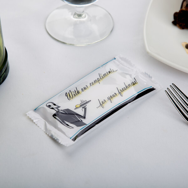 This Royal Paper RF1MU 7" x 8 1/2" moist towelette / wet nap hand wipe is larger and more elegantly packaged than your regular towelette. Serving as a great upscale alternative to traditional moist towelettes, this item features a delightfully fresh and clean scent.