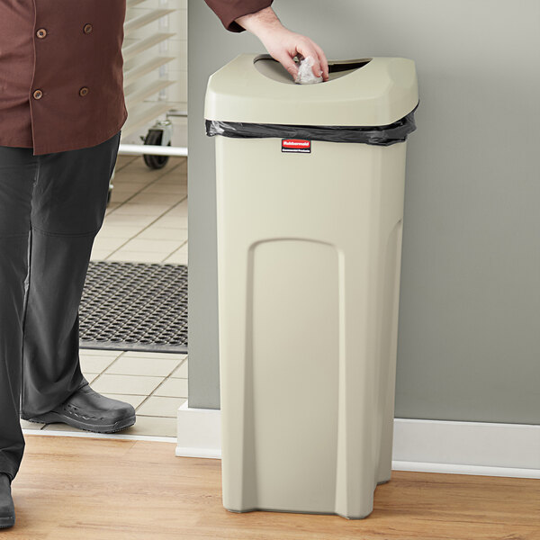 Rubbermaid® 6903569BGKIT Untouchable 92 Qt. / 23 Gallon Beige Square Trash Can with Drop Shot Lid