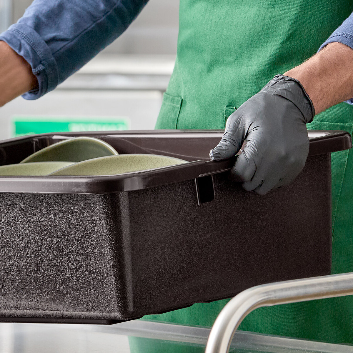The ribbed interior bottom of this tub helps prevents plates, bowls, and glasses from sliding around excessively during transport, resulting in fewer broken dishes. Plus, the ribbed underside matches up with other tubs for easy, non-stick stacking!