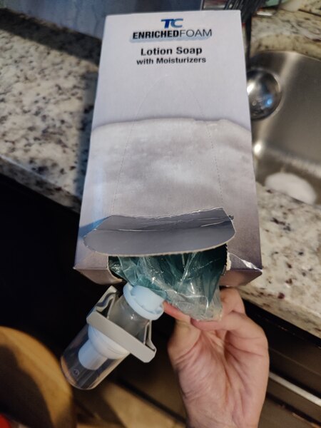 Great foaming soap with a good scent! A lot of these industrial type formulations smell cloying or leave a film, but this one is lightly floral and cleans well. I used this to refill bottles rather than a wall dispenser and it works perfectly - just cut a small corner in the bag container.