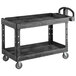 Easily transport a wide variety of products, supplies, or equipment with the Rubbermaid® FG454600 BRUTE black large two lipped shelf utility cart! This utility cart is made of sturdy structural foam for long-lasting durability, and its two lipped shelves can hold a wide variety of items while helping to prevent spills. The molded-in storage compartments, holsters, hooks, and notches make it easy to load this cart to the brim with supplies, and its ergonomic handle makes it easy to maneuver. The rounded corners help protect walls and furniture from scratches and bumps, and thanks to its 4" casters, this cart is conveniently mobile.