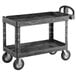 Easily transport a wide variety of products, supplies, or equipment with the Rubbermaid® FG454610 BRUTE black large heavy duty two shelf utility cart! This utility cart features a sturdy structural foam construction for maximum durability, and its two shelves are designed to hold a wide variety of items. The rounded corners protect walls and furniture from scratching, and the molded-in storage compartments, holsters, hooks, and notches make it easy to load this cart to the brim with supplies. Both shelves are lipped to help prevent spills, and its ergonomic handle makes it easy to move this cart from place to place. And thanks to its pneumatic wheels, this cart is conveniently mobile.