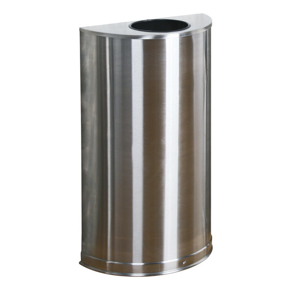 Meet the needs of your upscale interior decor with this Rubbermaid® SO12 Metallic half round waste receptacle that offers fresh, functional design! This 12 gallon indoor receptacle is perfect for your hotel lobby, convention center, or banquet hall. It includes a leak-proof rigid plastic liner, and it is made of heavy-gauge, fire-safe stainless steel with a satin finish that includes 30% post-consumer recycled content! The half round design fits flush against a wall to reduce obstruction in high-traffic areas.