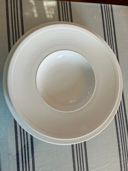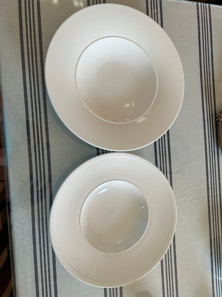 The Acopa Liana 12 oz. Bright White Embossed Lines Wide Rim Porcelain Pasta Bowl are beautiful. The embossed lines are very feint. Color is not as bright white as what I thought it would be but it will do.