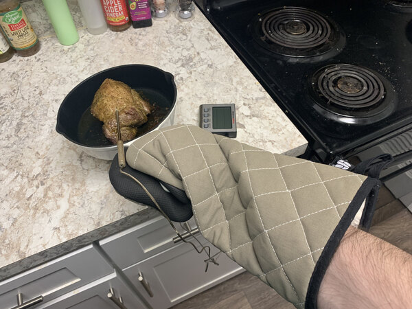 Can't feel any heat for 20 seconds unless you go over 500F. Thin but durable. Comes with a magnet to stick it to a metal wall but the magnet is so small the glove starts to slide; don't need that feature any ways so still 5 star.