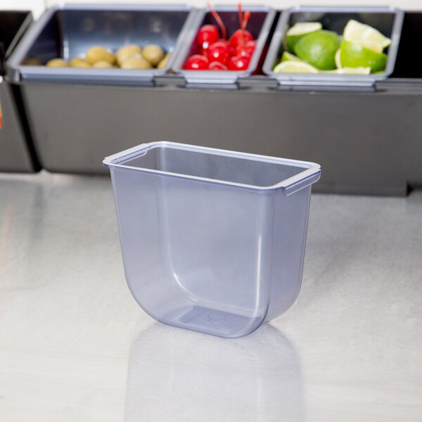 This San Jamar BD105 1.5 pints clear plastic deep tray will be the perfect addition to your establishment's The Dome and Mini Dome condiment centers. Made out of high-impact plastic, this tray is extremely sturdy and durable. It's designed for use with your The Dome and Mini Dome condiment or garnish centers, allowing you to quickly, conveniently, and easily change trays and replenish condiments and garnishes. Use it to replace the trays that came with your condiment center, or to keep extras on hand for quick and easy refills.