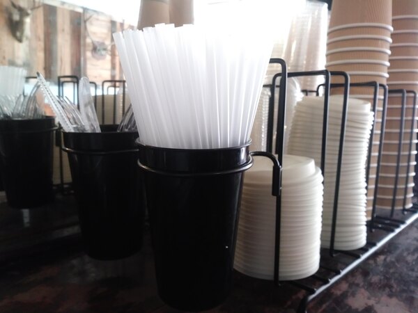 This thing works...sort of. It is very small (in diameter) so it doesn't hold very many straws. The ones it does hold, it doesn't hold very well. If they are wrapped, then when a customer pulls one out, several more come following after it because the walls of the holder are too smooth and provide no friction to keep the rest of the straws in place. Then, the darn thing has a small capacity so you have to constantly refill it due to customers actually taking straws and then to straws falling on the ground. It now sits on my desk and holds pencils.