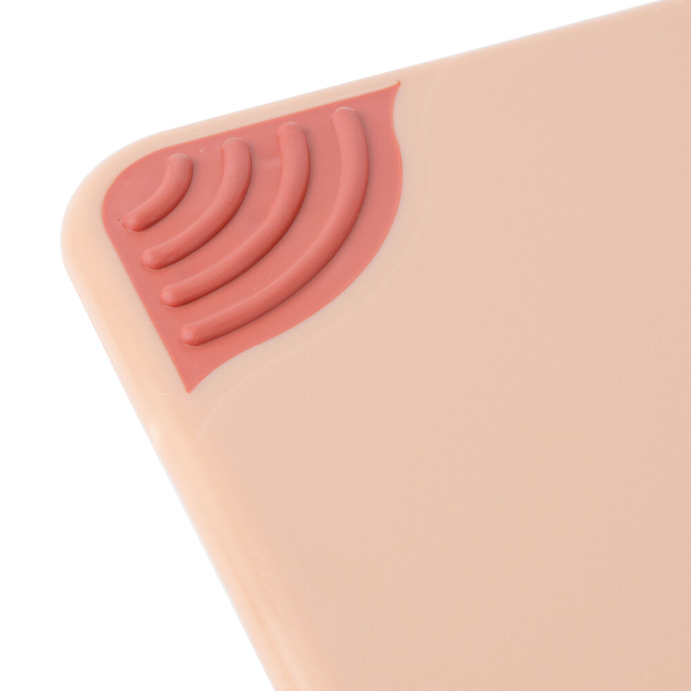 This cutting board is made to help limit unwanted knife dulling, but tough enough to prevent unsafe cut-grooving where dirt and bacteria can hide. This board also features non-slip grips on the corners which eliminate the need to use an unsanitary towel to prevent your cutting board from sliding around on the counter.