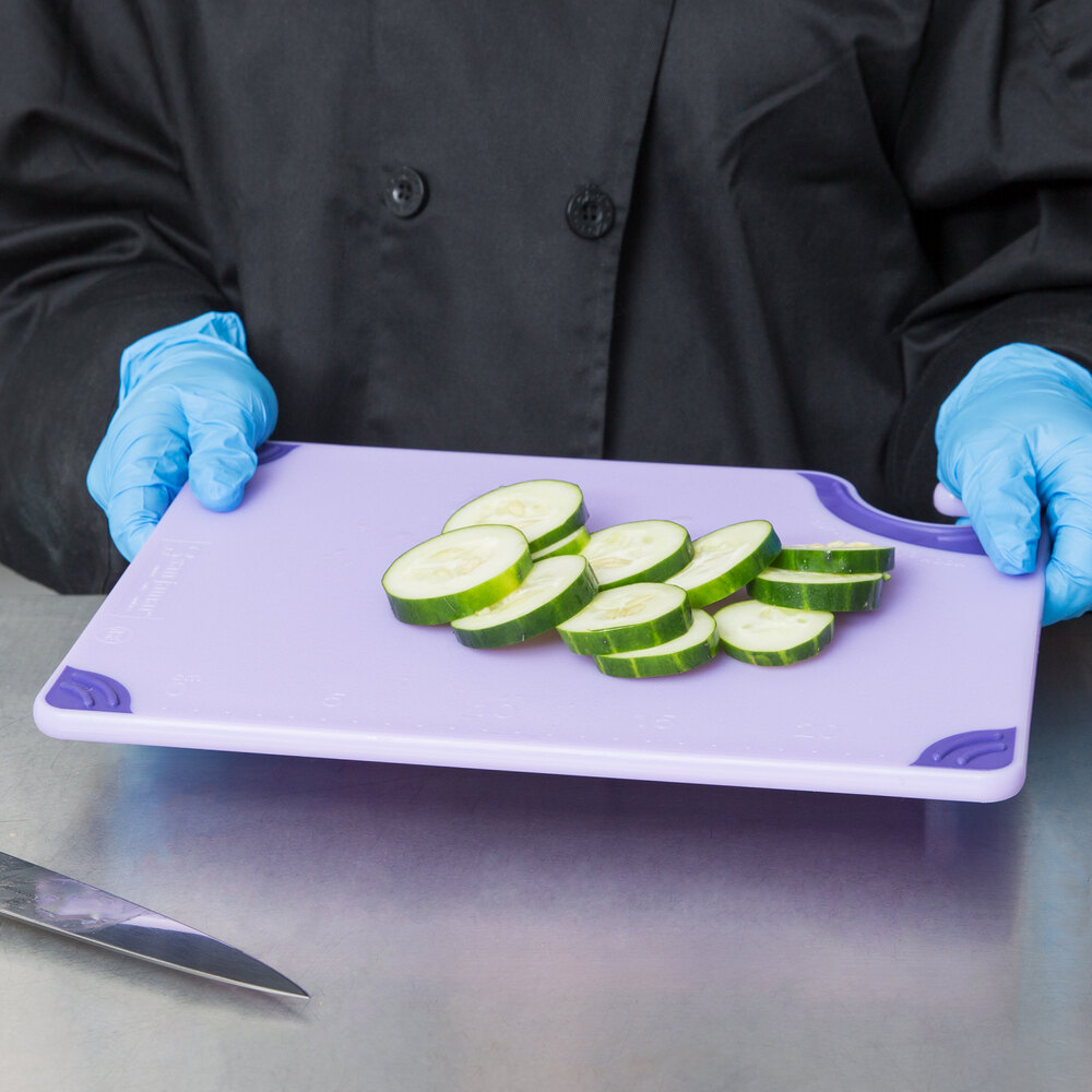 This purple cutting board even features embossed warnings on the surface to remind your employees to keep it separate from allergens and to wash it after every use. This ensures that your chefs comply with the USDA's Hazard Analysis and Critical Control Point (HACCP) program.