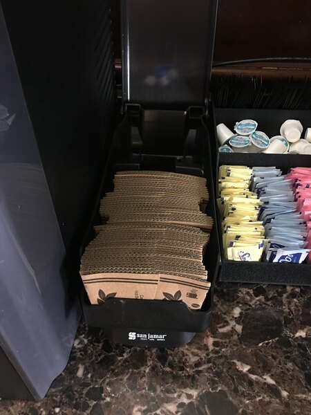 Coffee sleeves can get stuck sometimes even if you dont max out the quality in the dispenser. The dispenser offers various ways to mount and place the product. Overall good. Occasionally jams up. Not recommended for heavy use.