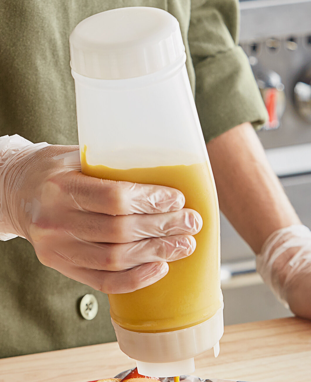 The durable yet flexible polyethylene bottle is easy to squeeze for fast application of ketchup, mustard, and mayonnaise. It features a clear bottle to easily see how much sauce is left with a white cap and yellow valve. Solid and valved caps are designed to fit on either end of the bottle. With its two wide mouths and smooth side walls, this bottle makes it simple to fill and dispense product, and it's easy to clean!