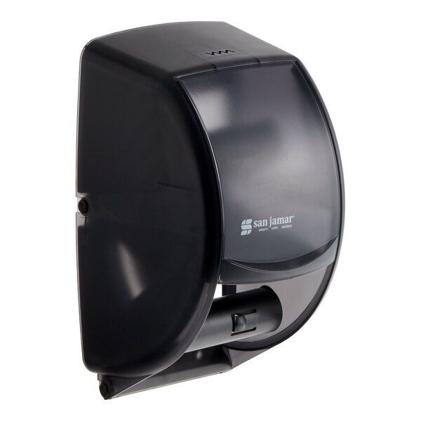 Eliminate waste by protecting a visible fresh roll until the first roll is completely used with the San Jamar R3500TBK Duett toilet tissue dispenser. Designed to accommodate two bath tissue rolls, the Duett dispenser's compact design makes it a perfect fit for any size washroom. With the Infinity system, just simply shift down the front panel to access the fresh second roll.