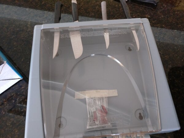 We TOTALLY love this knife holder, we've tried the magnetic style and the non-see through in the past and something always failed. This knife holder is really strong, see through so you can grab the correct knife every time, the front pops open so if it were to ever get dirty inside you can open and wipe out.