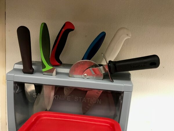 This knife station is such a great addition to our kitchen. We needed to add it to assist us in complying with health code; keep knives covered and staff safe from injury. We love the blades being covered. Great addition to our kitchen!