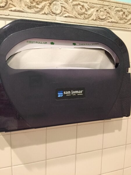 San Jamar toilet seat cover dispenser is a great addition to any public restroom. These take most standard cover refill packs and dispense covers one at a time.