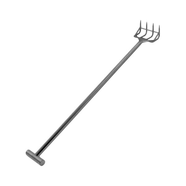 Easily move high volumes of food product with this Sani-Lav 60" heavy-duty stainless steel food service hygiene fork with super-reinforced angled tines! Constructed from heavy-duty type 304 stainless steel, this fork offers exceptional durability and corrosion resistance for long-lasting use. The 60" length and convenient T-shaped handle provide users optimal control and leverage, making it ideal for meat, dairy, seafood, food processing, and food service applications. Additionally, the 9" x 8 1/4" fork tip features 4 angled tines that are 33% larger and super-reinforced with a heavy-duty welded stainless steel plate, helping it maintain its shape and stability under heavy use.