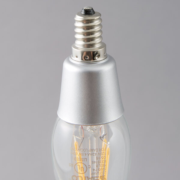 This Satco 4.5 watt clear warm white candle-shaped LED light bulb is equivalent to a 40 watt incandescent light bulb, but uses less energy and produces less heat than similar incandescent models. With a variety of features, including a sleek silver finish, classic CA11 torpedo shape, and a candelabra base, it is the lighting solution you need at your establishment! Due to manufacturer production variations, check the Compatibility resource to ensure this part is suitable for your application.
