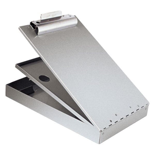 Offering the ultimate in organization, this Saunders 21017 Cruiser Mate 1 1/2" capacity 12" x 8 1/2" silver recycled aluminum storage clipboard with writing plate ensures privacy for sensitive records keeping. This clipboard is great for healthcare and law enforcement personnel. Use it to hold up to 1 1/2" of papers "on the go" under the high-capacity clip. Beneath this clip, two internal storage compartments hold documents and writing utensils out-of-the-way, with ease. The 7/16" upper tray holds smaller supplies, keys, or your phone, while the lower compartment holds larger stacks of papers, books, calculators, and writing utensils.