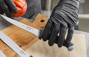 The finger guard formed into the handle increases control and stability and keeps hands safe by preventing contact with the blade while cutting. It also contributes to the ergonomic handle design, helping to ensure all-day user comfort and endurance while tackling rigorous and repetitive food preparation tasks.