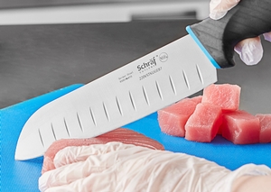 Part of a convenient HACCP colored cutlery line, this knife has a black / blue colored handle that allows it to stand out and makes it great for creating a color-coded system in your kitchen to prevent cross-contamination. Perfect for use in restaurant kitchens, delis, cafes, and culinary schools, this santoku knife is a great all-purpose knife that is best suited for slicing, dicing, and mincing. The granton edge style of the blade makes slicing more fluid by creating pockets of air between the blade and meat or vegetables, preventing sticking and allowing it to fall away after each cut.