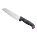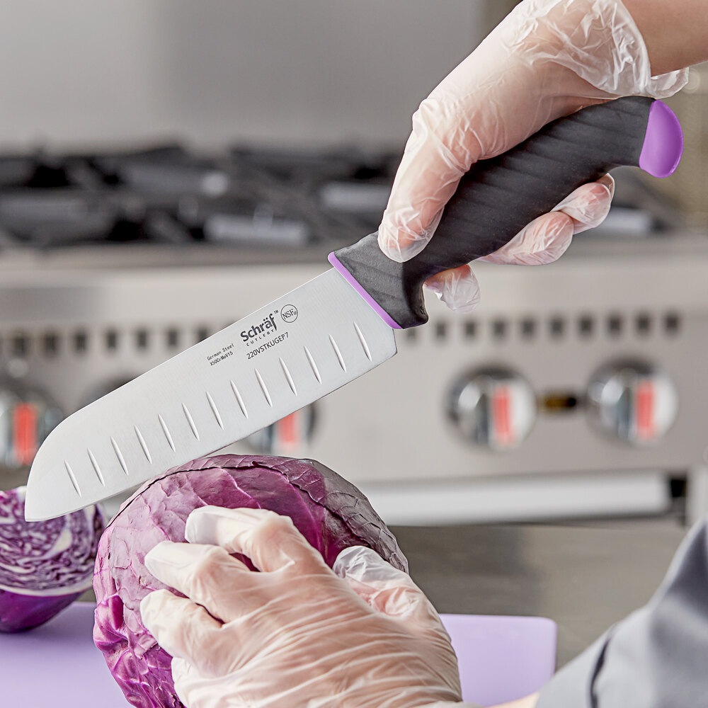 Upgrade your cutlery collection with this Schraf 7" Granton Edge Santoku knife with purple allergen-free TPRgrip handle.