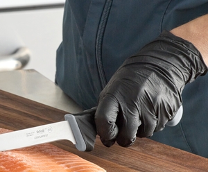 The finger guard formed into the handle increases control and stability and keeps hands safe by preventing contact with the blade while cutting. It also contributes to the ergonomic handle design, helping to ensure all-day user comfort and endurance while tackling rigorous and repetitive food preparation tasks.