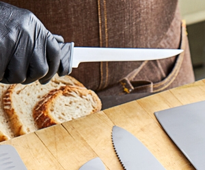 The finger guard formed into the handle increases control and stability and keeps hands safe by preventing contact with the blade while cutting. It also contributes to the ergonomic handle design, helping to ensure all-day user comfort and endurance while tackling rigorous and repetitive food preparation tasks.