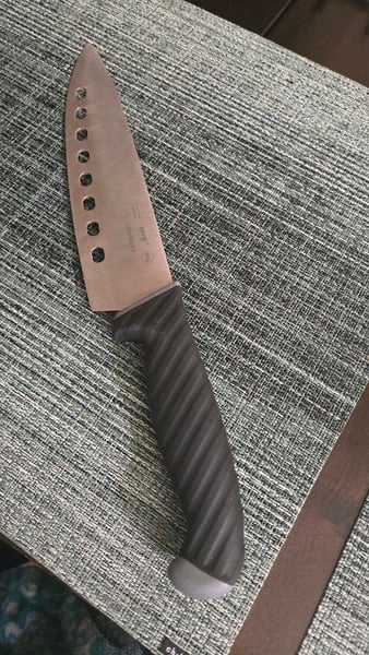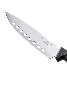 Excellent grip and easy to handle and manipulate—a very good, solid chef's knife. A little bit on the heavy side, but well-constructed and great quality for the price. I wouldn't hesitate to order another one when this one retires, lol. I'm in love with this brand and its quality! Nothing sticks, and you can use it for everything. Little by little, I'm buying the whole series.