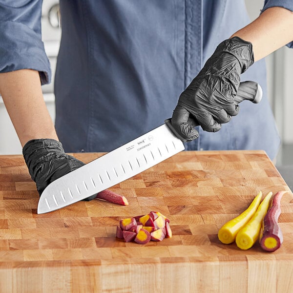 Its all-purpose design makes this knife wonderful for slicing, mincing, and dicing everything from meats and poultry to fruits and vegetables, greatly saving time during food preparation. Additionally, the granton edge blade creates air pockets between the blade and food, ensuring effortless use.