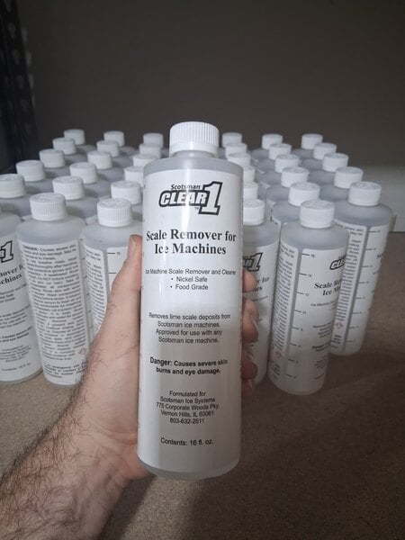 Keep your ice machine operating in top condition by utilizing the Scotsman 19-0653-01 clear 16 oz. liquid scale remover concentrate. Its non-diluted liquid formula is ideal for fast and effective descaling of dispensing parts, cooling elements, and other areas prone to scale build-up. Each bottle contains approximately 10 uses.