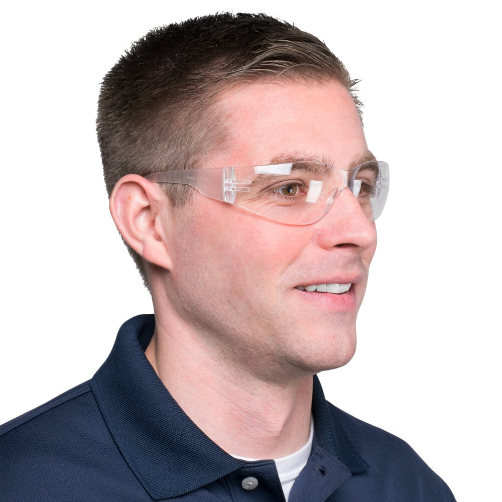 Each pair features a single, wrap-around, clear lens that blocks out 99.9% ultraviolet light, making it perfect for both indoor or outdoor use. The polycarbonate lens is held in place by a clear frame with spatula-style temple design for a snug fit around your ears. An integrated nose piece is included with each pair of these modern safety glasses for superior comfort during wear. Additionally, these glasses meet ANSI Z87.1+ standards to ensure that your employees are well protected.