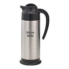 Keep your milk perfectly chilled with this Service Ideas SteelVac™ 33.8 oz. stainless steel insulated "Skim Milk" creamer with black footed base and lid! Designed with a virtually unbreakable stainless steel liner, the vacuum insulation of this creamer retains the temperature of its contents for 4-6 hours, ensuring that your milk stays fresh and at the correct serving temperature. This creamer features a "Skim Milk" graphic that is laser etched onto the body, making it easy to distinguish among various dairy options. The brushed stainless steel body with black plastic lid also offers a professional look that complements the decor of any setting.
