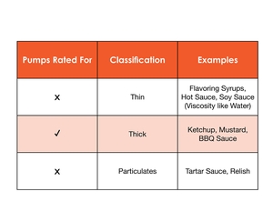 This pump is not recommended for thinner condiments/syrups that contain a low viscosity such as soy sauce. We recommend these pumps for thicker condiments with high viscosity such as ketchup and barbeque sauce. These pumps are not meant for condiments with particles (such as relish).