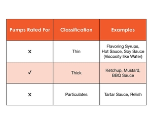 This pump is not recommended for thinner condiments/syrups that contain a low viscosity such as soy sauce. We recommend these pumps for thicker condiments with high viscosity such as ketchup and barbeque sauce. These pumps are not meant for condiments with particles (such as relish).