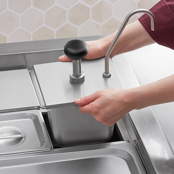 Easily store, dispense, and portion your condiments with the ServSense 0.4 fl. oz. stainless steel pump dispenser with 1/6 size Vigor hotel pan.