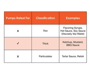 This pump is not recommended for thinner condiments/syrups that contain a low viscosity such as soy sauce. We recommend these pumps for thicker condiments with high viscosity such as ketchup and barbeque sauce. These pumps are not meant for condiments with particles (such as relish).
