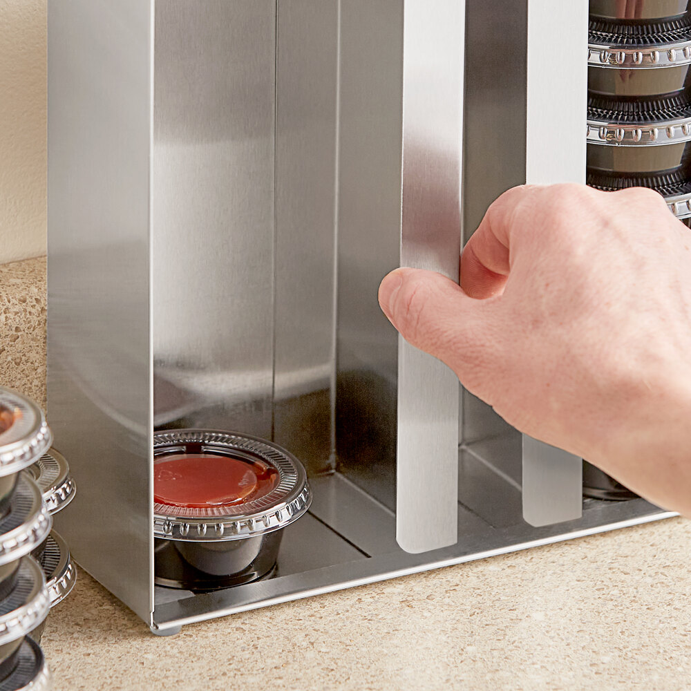 This organizer is made from durable stainless steel that not only stands up to the rigors of daily use but offers a professional and modern presentation to your self-service station. It features 3 compartments which can be used for portion cups or lids. Additionally, this organizer's non-skid feet allow it to sit securely on countertops in busy, high-traffic areas.