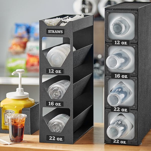 This organizer's tiered design also makes efficient use of countertop space, perfect for locations big and small. This organizer includes a convenient oz. label sticker sheet to help customers identify lid sizes, and its classic black color helps conceal signs of wear and allows it to seamlessly complement your existing decor. This unit is a practical addition to any self-service station. Its smart, space-efficient design promotes a professional and orderly display.
