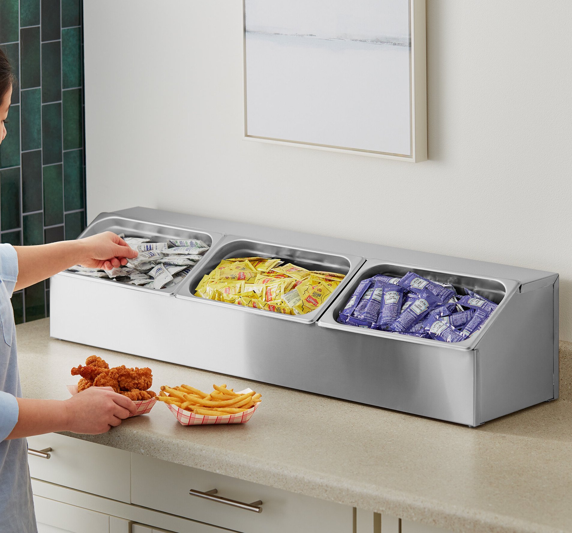 Non-skid feet are included on the bottom of the unit and pans are easy to drop in and remove, allowing staff to quickly replace or refill pans as needed. This non-insulated organizer can also store non-refrigerated condiments and other supplies, making it a versatile option.