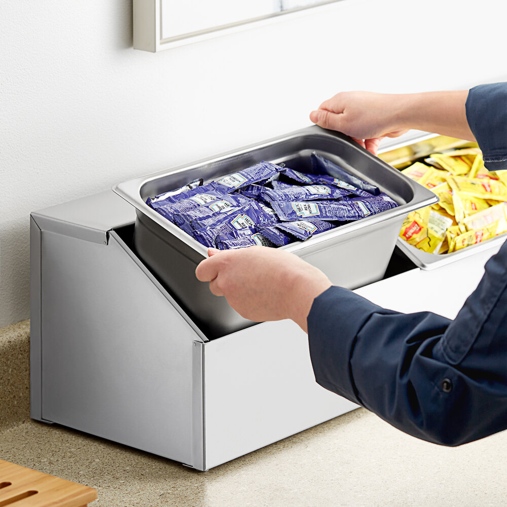 Non-skid feet are included on the bottom of the unit and pans are easy to drop in and remove, allowing staff to quickly replace or refill pans as needed. This non-insulated organizer can also store non-refrigerated condiments and other supplies, making it a versatile option.