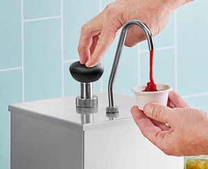 Designed with a fixed nozzle for stability, the pump is ideal for use with thicker condiments, such as ketchup, barbecue sauce, and mustard. This pump is not recommended for thinner condiments/syrups that contain a low viscosity such as soy sauce. This pump is also not meant for condiments with particles (such as relish).
