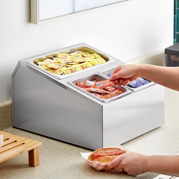 This is a great stainless steel condiment packet holder. The ability to swap a standard 1/3 stainless steel pan that in the stand with another 1/3 size pan that is fully stocked allows us to quickly "restock" the unit during peak hours.