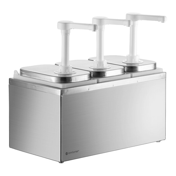 ServSense Triple 2 Qt. Stainless Steel Condiment Dispenser - 3 Plastic Pumps, 1 oz. Portions