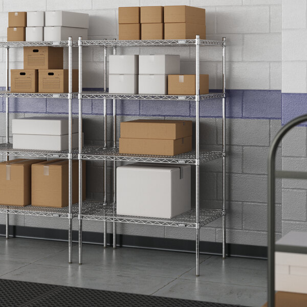 Designed for use in dry environments, this shelving unit is an excellent choice for organizing and maximizing storage space. Whether you're looking to streamline your warehouse operations or simply need additional storage in your industrial facility, this heavy-duty shelving kit is the perfect solution. Mix and match with Lavex Pro accessories (sold separately) to personalize your kit! Invest in the Lavex Pro chrome heavy-duty 4-shelf kit and experience the durability and functionality it brings to your workspace.