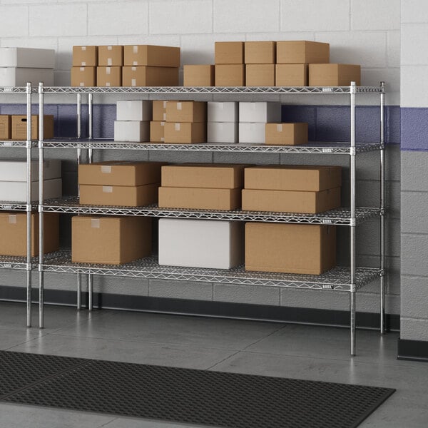 Designed for use in dry environments, this shelving unit is an excellent choice for organizing and maximizing storage space. Whether you're looking to streamline your warehouse operations or simply need additional storage in your industrial facility, this heavy-duty shelving kit is the perfect solution. Mix and match with Lavex Pro accessories (sold separately) to personalize your kit! Invest in the Lavex Pro chrome heavy-duty 4-shelf kit and experience the durability and functionality it brings to your workspace.