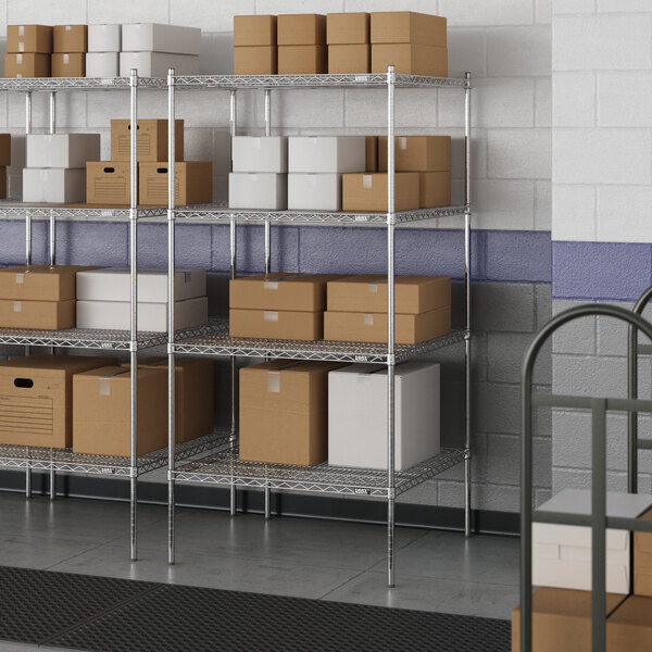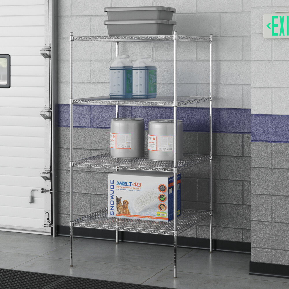 Designed for use in dry environments, this shelving unit is an excellent choice for organizing and maximizing storage space. Whether you're looking to streamline your warehouse operations or simply need additional storage in your industrial facility, this heavy-duty shelving kit is the perfect solution. Mix and match with Lavex Pro accessories (sold separately) to personalize your kit! Invest in the Lavex Pro chrome heavy-duty 4-shelf kit and experience the durability and functionality it brings to your workspace.