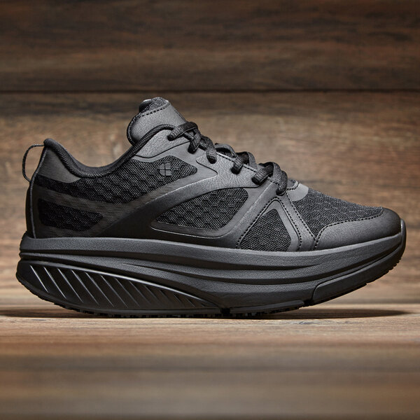Take on the tasks of each day with this Shoes For Crews 28500 Energy II women's size 9 1/2 medium width black water-resistant soft toe non-slip athletic shoe. Thanks to its ventilated and natural fit design, this shoe is the perfect option to wear while completing routine work. Its wedge rocker heel provides superior shock absorption, while the padded collar and removable cushioned insole also create a soft inner layer that helps reduce stress from standing or walking. Inside, a spillguard protective membrane lining redirects any hot liquid for the ultimate protection.