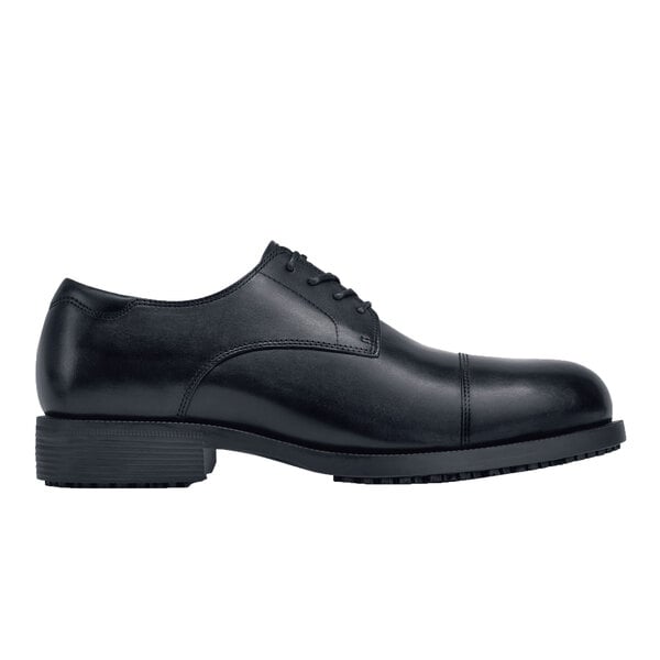 Polish off your formal attire with this Shoes For Crews 8201 Senator men's size 12 medium width black water-resistant steel toe non-slip dress shoe. Made from leather and designed to have a tailored fit, this shoe offers a timeless and elegant look that is perfect to wear at formal parties, catered events, or in the front-of-house area of restaurants. The padded collar and EVA infused foam insole create a soft inner layer that reduces the stress that comes from standing or walking for long periods of time.