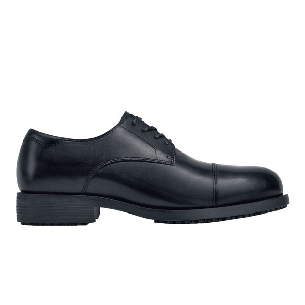 Polish off your formal attire with this Shoes For Crews 8201 Senator men's size 7 1/2 medium width black water-resistant steel toe non-slip dress shoe. Made from leather and designed to have a tailored fit, this shoe offers a timeless and elegant look that is perfect to wear at formal parties, catered events, or in the front-of-house area of restaurants. The padded collar and EVA infused foam insole create a soft inner layer that reduces the stress that comes from standing or walking for long periods of time.